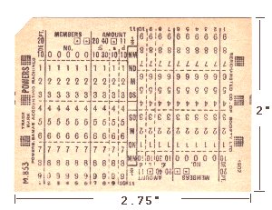 Punched Cards, were standardized, for most of the industry, at 80 Columns, but there were other formats, see below for a 21 column, punch and cards, as Produced by Powers Samas. The company was later merged with ICT, however the incredible fact was that, the Powers Samas machines, from puches to tabulators, were mostly mechanical. If you took the covers off, you could wind the machine over by hand, and without power applied, it would read cards, calculate totals. Then print the result, the program to do all of this was enshrined within another mechanical wonder, the connection or ( CON ) box. The picture of the 21 Column card below shows, that the card could be used as printed, with data in columns 1 to 10, then turned upside down, at a later date, and reused the other end, making for a very economical use of media, and the ultimate in recycling.