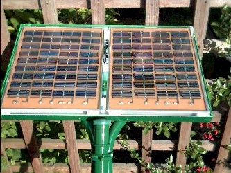 The left two photo's above are of the solar array and the right is of the control unit. The battery is the small control unit battery, once this is charged the output is diverted to the storeage battery, which is about a 75 amp/hour capacity.
