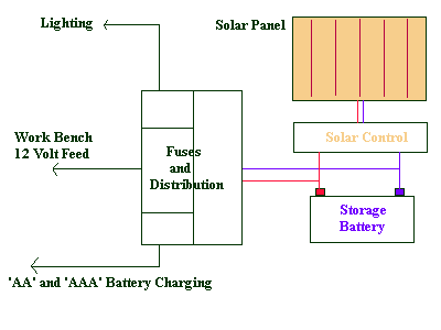 The simple array by shed 3 gives 750m/a in bright sunlight, but only 50 m/a on an overcast day, Hence the Controller that with only 15 m/a of power, controls which batteries get what power, when it is available. The constant trickle charge gives me power to play with for simple projects. I do like the fact that my mp3 player runs on rechargeable batteries that get charged for 'free' all year round.