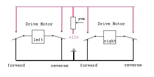 The overall plan is again very basic. The software drives the four relays in a simple bridge configuration. So simple in fact that the software has to allow change over time from full forward to full reverse, to limit current surges. I have now installed current limiting and speed control via a pulse width control in the power feed lines to the drive motors. I am using Hexfet transistors on large heatsinks, as these devices were rated at 39 amps. I am now of the opinion that the limiting factor on these transistors is the size of the leads into the package. To date these have proved very rugged the relay points seems to be the weakest link in the chain.