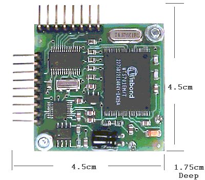Early in 2003 my plans for simple speech output, were growing along with the Lo-res vision system. However the CPU load was rising very fast and even moving to a 386 or 486 motherboard, would have still meant that, I lacked the processing speed to control the mobile and produce speech at the same time. I have tried to keep this project low tech, partly in the hopes that it would force me to be economical, as well as reserving the future CPU bandwidth ( Pentium Derivatives ) for route planning and vision analysis. Having revisited some old projects, I started to review the hardware only solutions again. Historically this would have been a SPO256AL type chip, with a preprocessor to string the allophones together. Time has marched on and the hardware only solutions have improved. Enter the SP03, a winbond powered text to speech processor in a diminutive package only 4.5 cm x 4.5 cm ( including piezo electric speaker ).